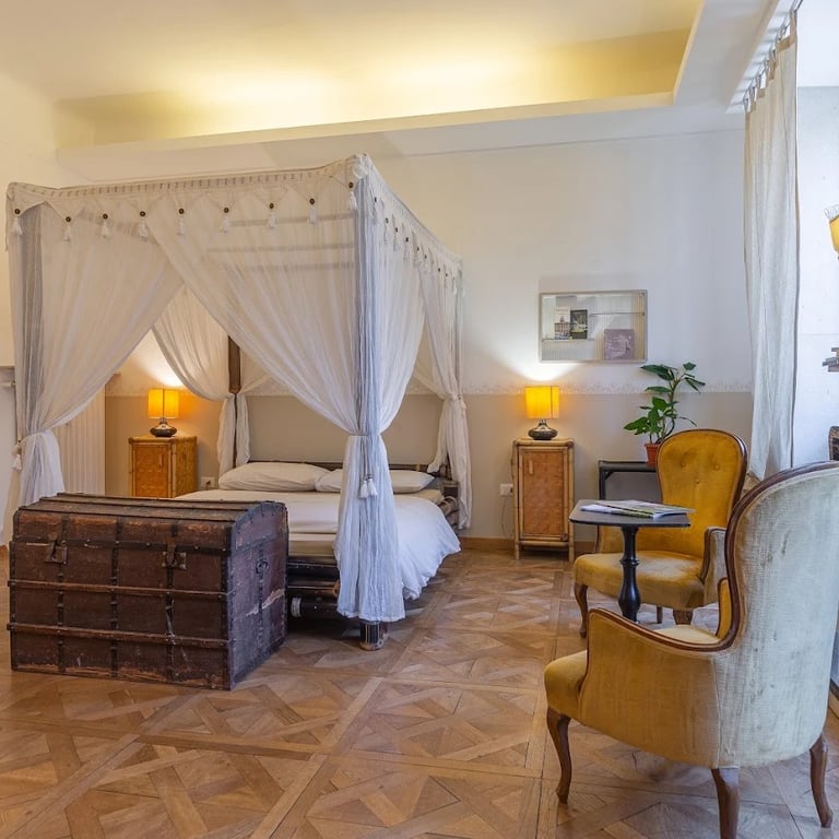 Gli ambienti sono raffinati, con elementi d’epoca come pavimenti in parquet ispirati al Castello di Miramare, bauli storici, cartine geografiche antiche e un suggestivo letto a baldacchino.